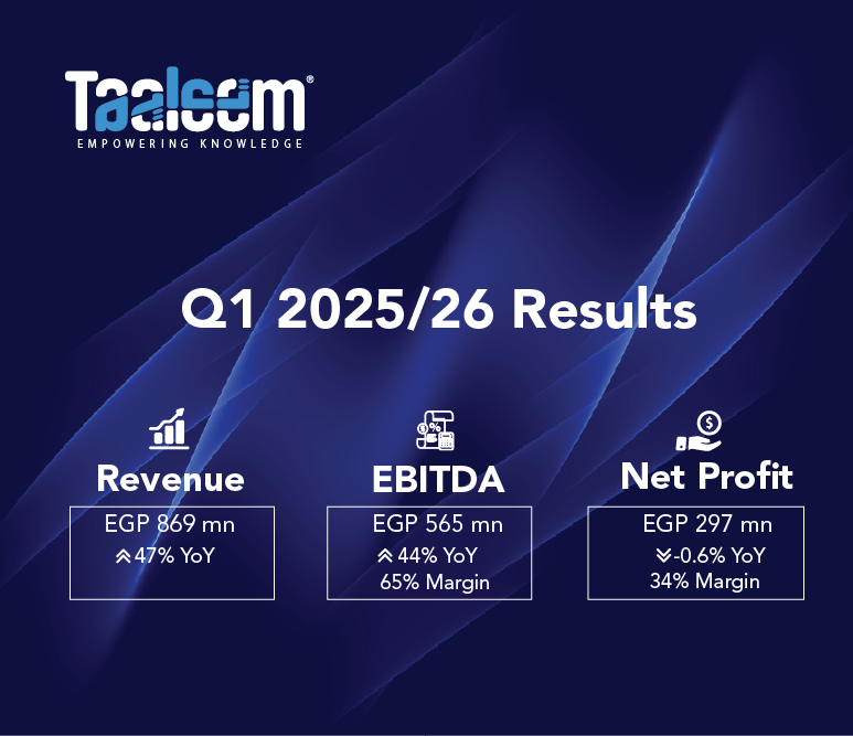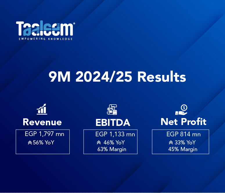 Taaleem FY 24/25 Financial HighlightsTotal Revenue: EGP 1,848 mn, marking a robust 53% YoY growth.Gross Profit: EGP 1,308 mn, up 42% YoY, with a gross profit margin of 71%.EBITDA: EGP 941 mn, rising 40% YoY, with a margin of 51%.Net Income: EGP 580 mn, increasing 5% YoY, with a net margin of 31%.Cash & Cash Equivalents: EGP 276 mn, while total debt stood at EGP 2.5 bn, resulting in a net debt position of EGP 2.2 bn, in line with Taaleem’s growth and capital structure...